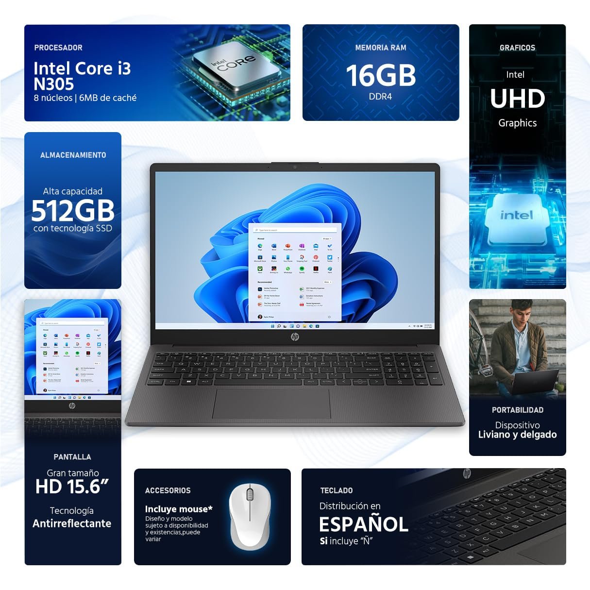 | Más | Marca: HP Fabricante: HP Series: 250 G10 Tamaño del área de visualización de la pantalla con pie: 15,6 Pulgadas Resolución: 1366 x 768 Pixels Marca del procesador: Intel Tipo de procesador: Intel Core i3 Velocidad del procesador: 1,8 GHz Número de procesadores: 1 Tamaño de RAM: 16 GB Tecnología de la memoria: DDR4 Tipo de memoria del equipo: DDR4 SDRAM Memoria máxima compatible: 16 GB Tamaño de la unidad de disco duro: 512 GB Descripción del disco duro: SSD Marca de la tarjeta gráfica: Intel Descripción de la tarjeta gráfica: Integrada Tipo de RAM para gráficos: Shared Interfaz de la tarjeta gráfica: Integrado Sistema operativo: Windows 11 Home Dimensiones del paquete: 40 x 30 x 8 cm | 3 kg Número de modelo del producto: Core i3 N305 + 16GB + 512GB SSD Producto en Amazon.com.mx desde: 10 julio 2025 Opinión media de los clientes: 4.6 4.6 de 5 estrellas (24) 4.6 de 5 estrellas Clasificación en los más vendidos de Amazon: nº48,486 en Electrónicos (Ver el Top 100 en Electrónicos) nº591 en Portátiles Tradicionales Comprar en Amazon: https://amzn.to/3O0cgC9 Comprar en Mercado Libre: https://mercadolibre.com/sec/2pCAtu5 |