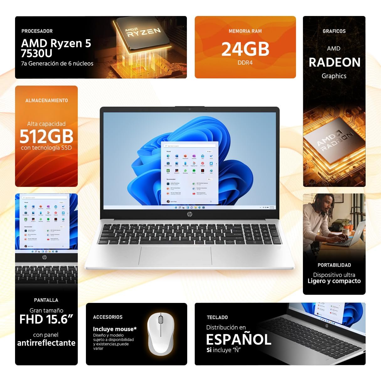 El combo Procesador/RAM: El AMD Ryzen 5 7530U es un procesador hexacore (6 núcleos) muy solvente. Al sumarle 24GB de RAM, el sistema “vuela” en tareas de oficina. Es difícil encontrar esta cantidad de memoria en este rango de precios.