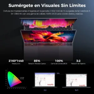 | Pantalla y Experiencia Visual | Tamaño de la pantalla: 14 Pulgadas Resolución de la pantalla: 2160×1440 – 2K Velocidad del Monitor: 60 Hz Tipo de Panel: IPS Cobertura de color (Pantalla): sRGB 100% Nivel de brillo (NITS): 300 Pantalla táctil: No |