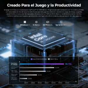 | Potencia y Rendimiento (El Motor) | Puntaje de rendimiento (CPU): 26935 Generación del procesador: Intel Core i9-13xxx Modelo del procesador: i9-13900HK Capacidad de memoria RAM: 16GB Modelo de tarjeta gráfica: Intel Iris Xe Graphics |