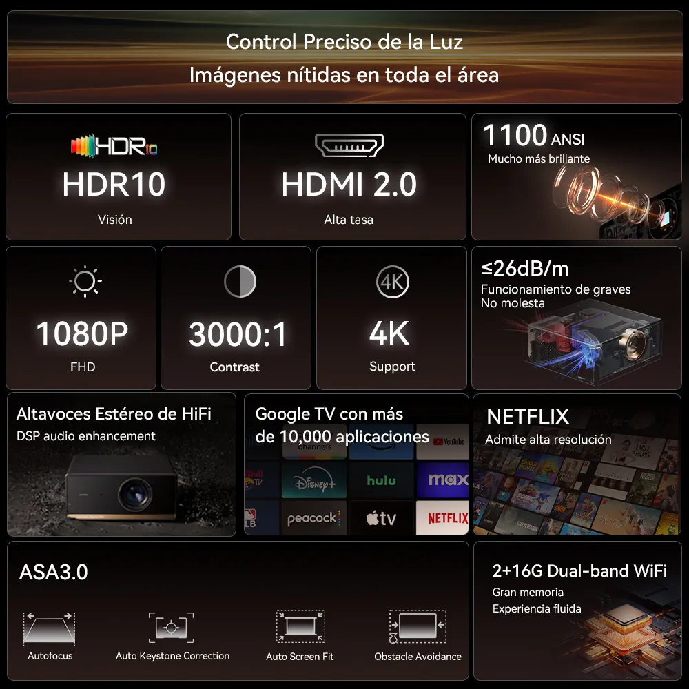 Mira, te platico. Lo que me encanta de este modelo es que no tienes que ser un experto para echarlo a andar. El diseño en negro se ve elegante, nada que ver con esos proyectores blancos que parecen de oficina. Tiene 2GB de RAM DDR4, que para un proyector es aceptable; eso significa que los menús se mueven rápido, sin esos retrasos que te dan ganas de aventar el control.